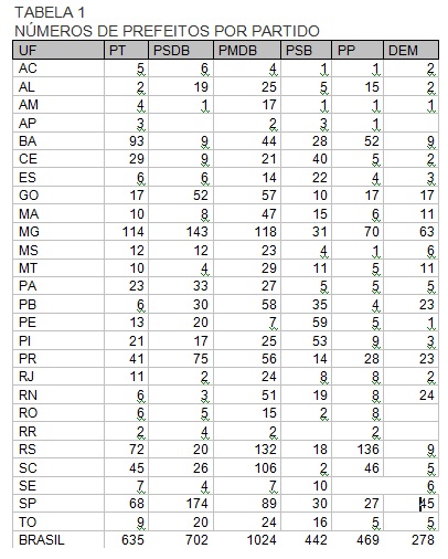 Evidencio que faço questão de apresentar e avaliar esses dados nesse primeiro momento porque, daqui a alguns dias, pretendo esmiuçar detalhadamente o quadro da composição de forças políticas que passam a compor o cenário nacional a partir dessas eleições. Só para conhecimento, abaixo há duas pequenas tabelas: a primeira relacionada ao número de prefeitos que os partidos tiveram por estado, a outra com relação ao número de eleitores que os partidos governarão a partir de 2013.