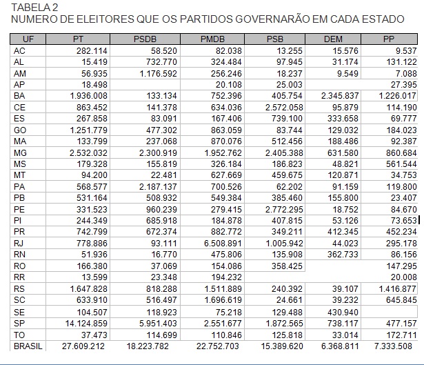 Assim sendo, vamos governar um contingente de 27,6 milhões de eleitores. Mas a grande polêmica que se trava na mídia é não esclarecer didaticamente estes dados e discutir exclusivamente na política o que interessa a ela (a MÍDIA). Pego como exemplo o alarde que se faz em torno dos personagens Aécio Neves (PSDB) e Eduardo Campos (PSB). Abaixo mostrarei uma tabela com bastante clareza sobre a distribuição geográfica do resultado eleitoral, sobre esses partidos e sobretudo com relação a esses dois personagens. Faço isso para esclarecer ao leitor as razões do porque a imprensa tanto insiste em pô-los em evidencia.
